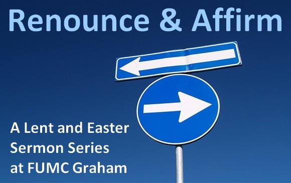This year, I am preaching a sermon series for Lent and Easter titled “Renounce and Affirm.” Though many of my series often depart from the RCL (lectionary), this one actually follows it from the First Sunday in Lent through Pentecost. Podcasts of these sermons can be found here. This past Sunday, however, we did not get an audio recording to post, so I thought I would blog-post the sermon for those who have requested it. Feel free to leave a comment if you desire.